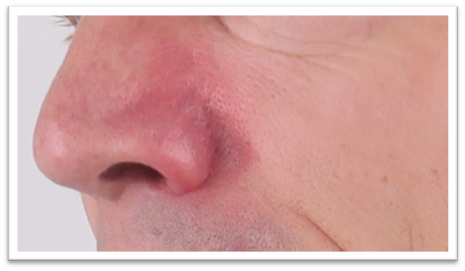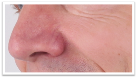 Före- och efterbilder, ytliga kärl på näsa och näsvinge. På den inzoomade efterbilden näsvinge är huden fortfarande rodnad efter behandlingen, detta försvinner efter en kort tid.